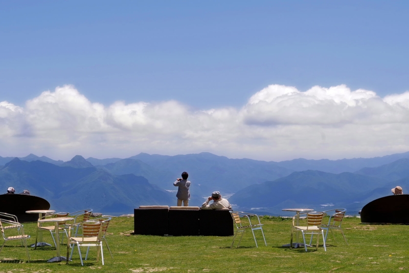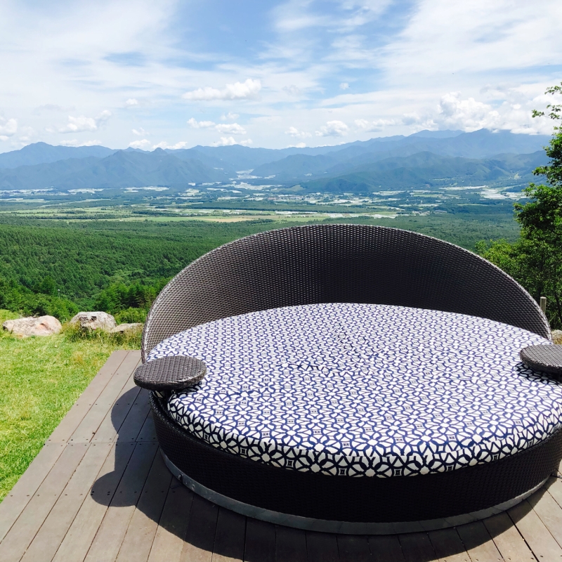 4月下旬〜11月上旬ごろまでの期間限定でオープンする絶景スポット「清里テラス」。標高1,900mの山頂にソファが並ぶ、まさに天空のテラス席からは、富士山や南アルプスの絶景を楽しむことができます。
