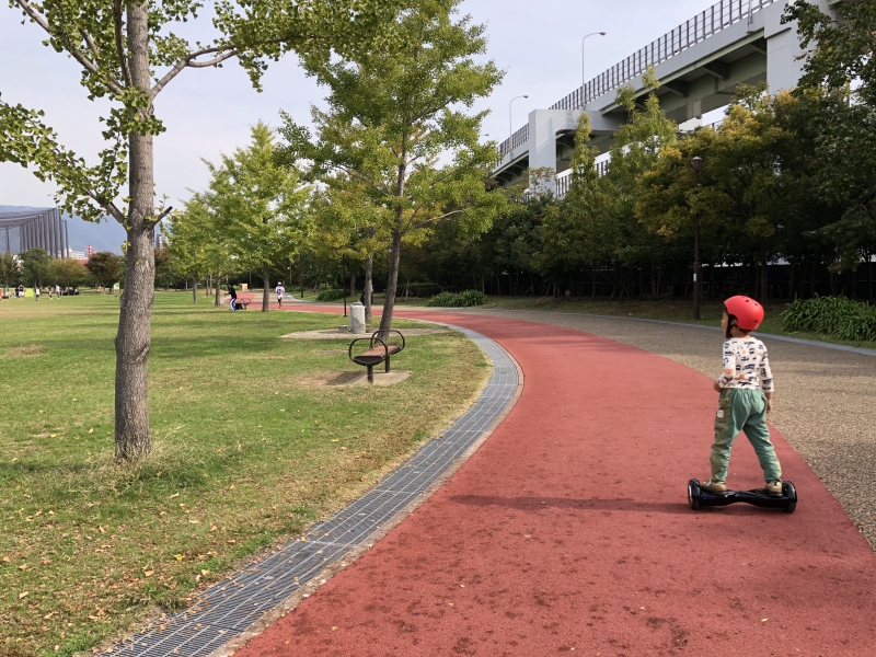 広い芝生広場は ランニングコート が、ぐるっと囲んでいます。普通の石の硬さのコートと、少し柔らかい赤いコートの2種類があり、ジョギングやウォーキングをする人、自転車の練習をしている子供もいっぱい。