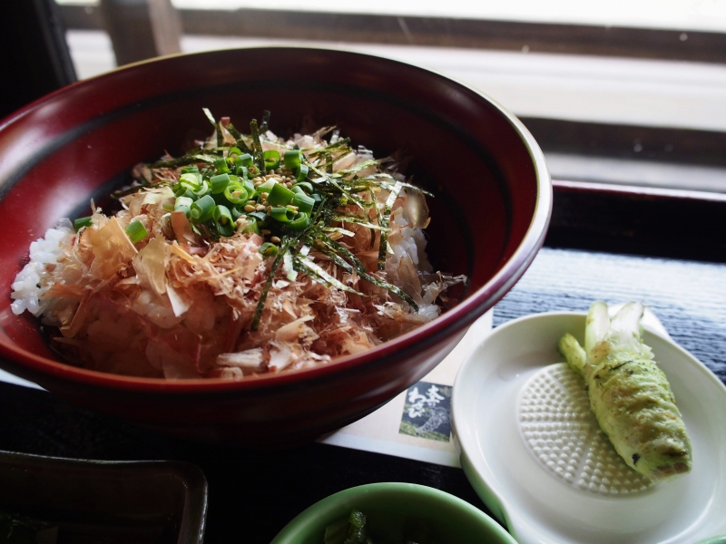 本わさび丼は温かいご飯に鰹とネギ、のりがトッピングされた状態で供されるので、そこに自分でおろした本わさびと、お醤油を少したらしていただきます。おろしたてのわさびの香りが良く、シンプルな食べ方だからこそ生の本わさびのおいしさを存分に味わえます。