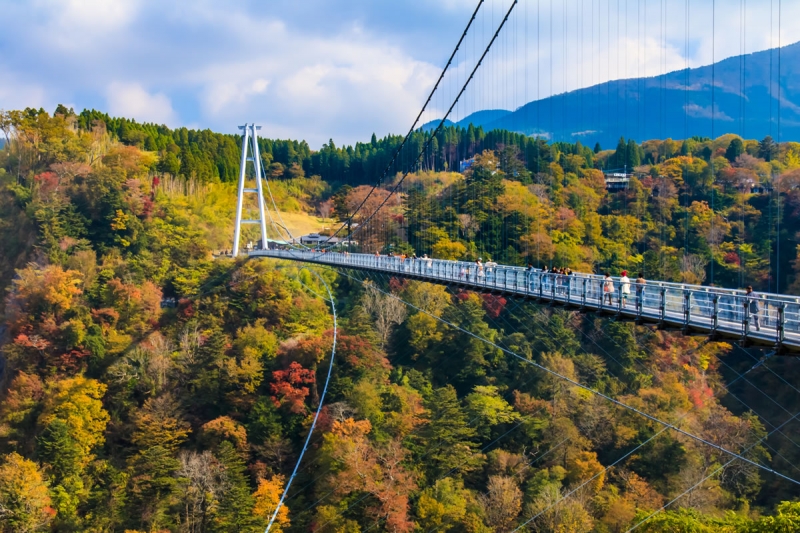 橋の上からは絶景が楽しめ、日本の滝百選に選ばれた「震動の滝」の雄滝や雌滝、秋には九酔渓の紅葉、そして天気のいい日には雄大な九重連山を眺めることができます。