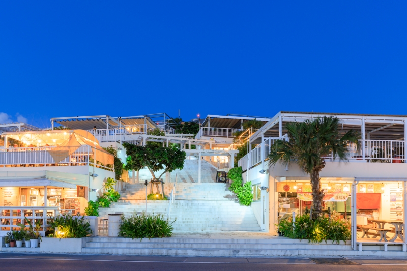 施設内には、海を目の前にして食事ができるレストランや、Made in Okinawaの素敵な商品が並ぶショップがあり、リゾート気分を存分に堪能できます。レストランは21:00(ラストオーダー20:30)まで、そのほかのショップは20:00までの営業で、ケバブなどを販売するSunset HUBのみ翌2:00までオープンしています。