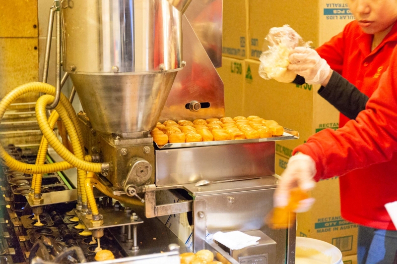 チャイナタウン名物と言えば「Emperor's Garden Cakes & Bakery(エンペラーズ・ガーデン・ケーキ&ベーカリー)」の「エンペラーズ・クリーム・パフ」です。南門から入ってすぐ左側にあるレストランの一角で販売していて、いつも通りに長い行列ができています。毎回その場で焼いたものを販売しているので、いつでも熱々のものを食べることができます。