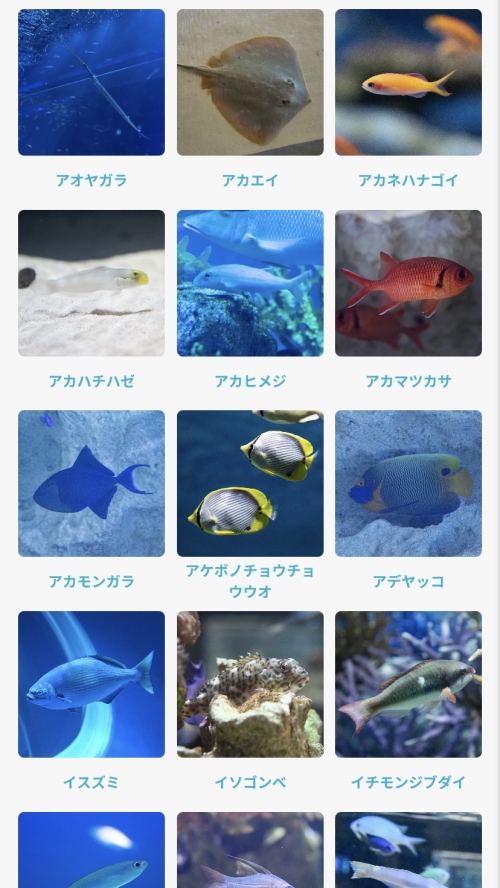 水槽の近くにあるパネルにアプリをかざすと、生き物の解説をみる事ができます。解説をみた生き物は、「いきもの図鑑」に記録されていき、一覧で見ることができます。また、 水族館にいる人気の生き物をアプリ内に集められる「いきものあつめ」という機能があり、スタンプラリーのようで子どもたちに大人気。