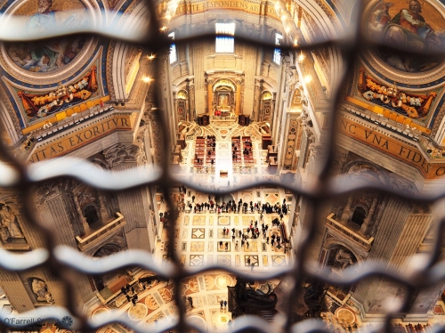 頭上には、ミケランジェロが設計した直径42mのクーポラ天井が間近に迫ります。クーポラ内部は一周できるようになっており、金網越しに見下ろすと、大天蓋や主祭壇がはるか下の方に見えます。天井壁画のモザイクにも触れることができるので、感動です。