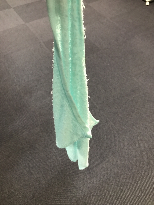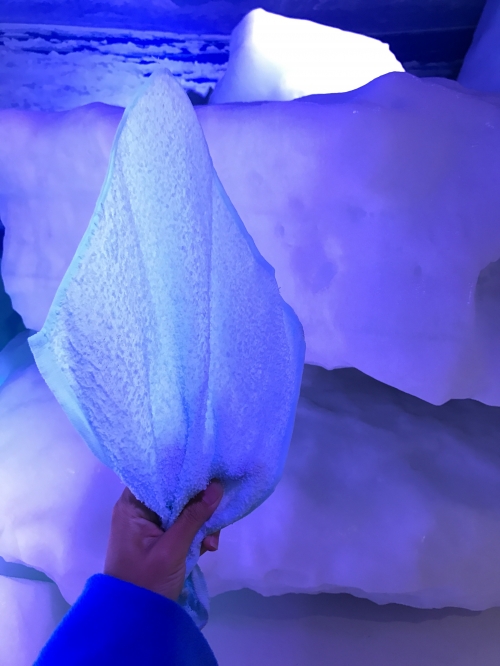体験室に入る前にもらえる濡れたタオル(写真左)も、マイナス15度のなかでぶんぶん振り回せば…写真右の通りに。