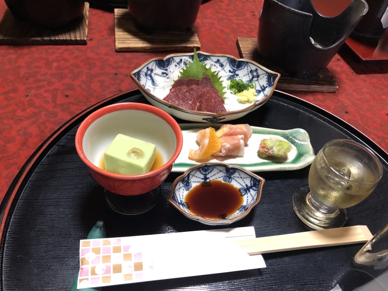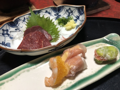 馬刺し、信州そば、鮎(夏季)、そして信州の牛と、その下に敷いてある自家製のお味噌が絶品です。