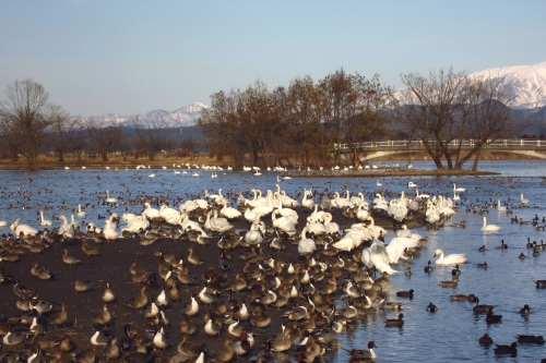 白鳥の渡来地として全国的に有名な、新潟県の「(ひょうこ)」。国の天然記念物に指定されており、冬にはシベリアから約5,000羽の白鳥が飛来します。この豊かな自然を残そうと整備されているのが「瓢湖水きん公園」です。白鳥や鴨などの水鳥を間近で観察することができ、名物となっている、白鳥おじさんによる餌やりも見ることができます。