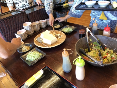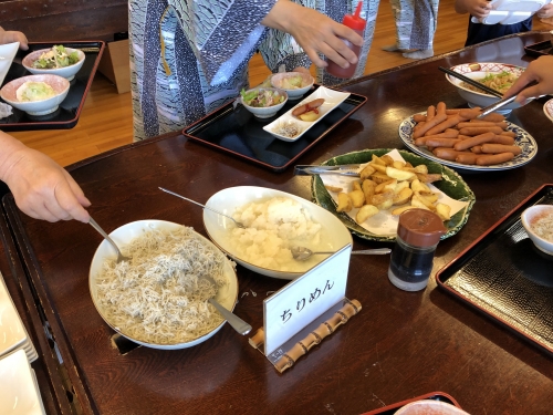 ちりめん に 出来立て手作り豆腐 や 知多野菜のサラダ 、小さなお子様が好きそうなソーセージや玉子巻き、ポテトフライもあります。前夜の夕飯でお腹いっぱいになったはずなのに、ご飯がすすんでしまいそうなおかずがてんこ盛り!