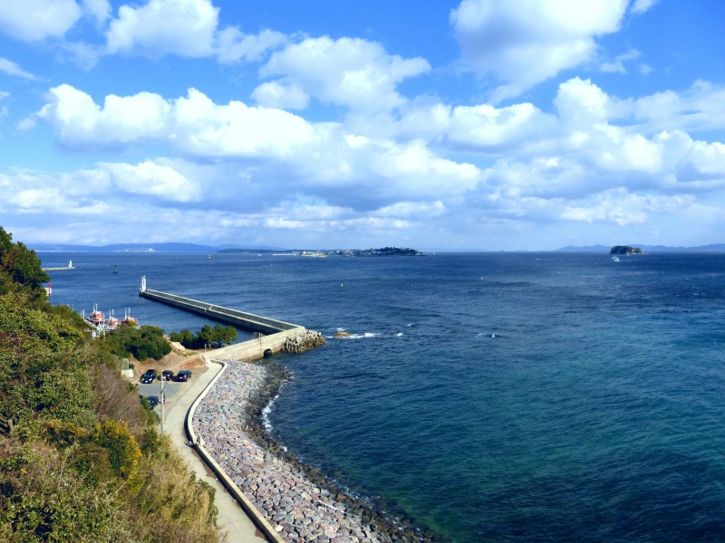 知多半島の最南端にある羽豆(はず)岬。羽豆神社と、神社を囲む鎮守の森に2つの展望台があり、”ウバメガシ”という天然記念物の常緑樹が生い茂る、全長800mの遊歩道が結んでいます。いずれの展望台からも、美しい三河湾の大パノラマの絶景を望めます。