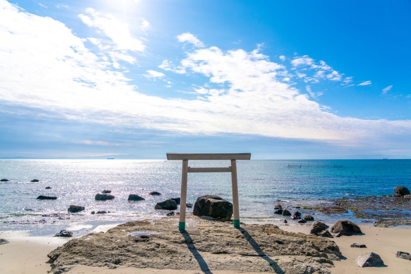 近年は、鳥居の向こうに海が広がっている様子が絶景として知られ、知多半島の中でも映えるスポットとして人気!また、夕方には鳥居ごしに夕日が沈む様子が眺められるほか、夜には星空と鳥居の美しいコントラストも楽しめますよ。