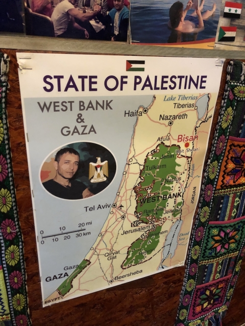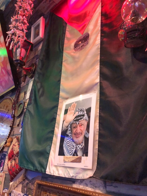 インテリアからは、パレスチナの! というアイデンティティの主張が伝わってきます。パレスチナの地図や国旗、パレスチナの著名な政治家「ヤーセル・アラファート」の写真などが印象的です。