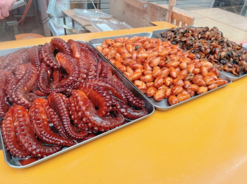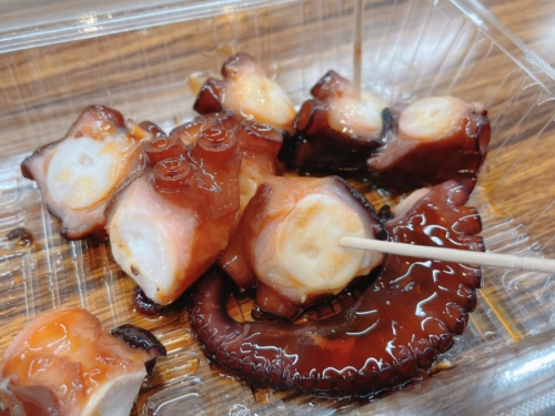 商店街中央部分にある海路では、「明石イイタコ煮」や「にし貝あまから煮」など販売されています。料金はグラム販売で、上記写真右の「明石タコのやわらか煮」は1本600円で購入しました。1本単位で購入できるのはもちろん、食べやすいサイズにカットしてもらえるのも食べ歩きには、嬉しいポイントです。