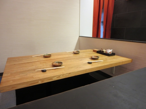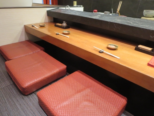 入店したら、靴を脱いで(脱いだ靴はスタッフが靴箱へ移動してくれます)案内される席へ。手前にカウンターが6席と、奥に4人掛けのテーブル席が2つあります。