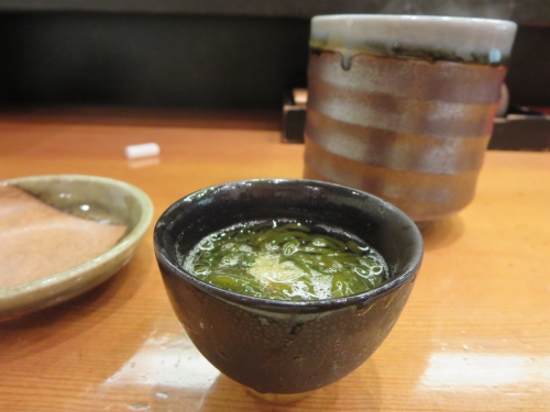 突き出しの淡路島のもずくは、しっかりした太さがあり、のど越しトゥルントゥルン!おろし生姜との相性も抜群で、酸っぱさにつられて食欲がわいてきます。「天然鯛」は、少しだけお醤油をつけていただきましたが、心地よい食感で上品な甘味を感じます。
