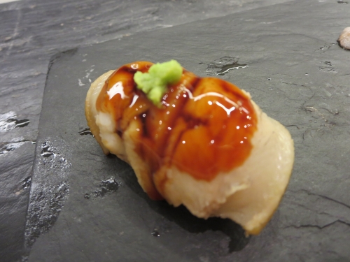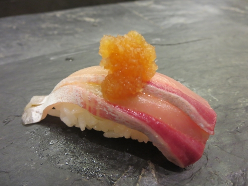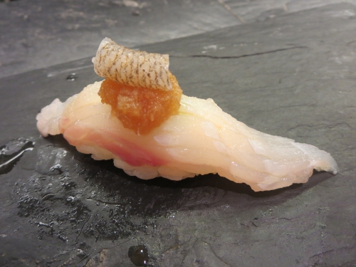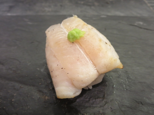 「ハマチの子どもです。」と置かれたのは「つばす」です。薄く切った2枚の切り身をずらすようにシャリに乗せており、そのままいただきます。おろし大根の効果で、余計にジューシーに感じました。「穴子」は、旨みあふれるなんとも上品な味。フワッフワです。