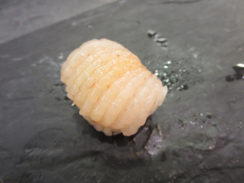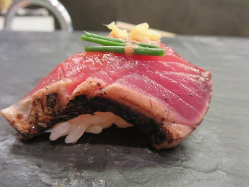 「太刀魚」は、肉厚だけどフワッと柔らかく、この日いただいた中でピカイチのネタでした!旨みを閉じ込めるために、炙られています。何もつけずにそのままいただきましたが、忘れられない美味しさ。「カツオ」も何もつけずにいただきます。カツオの上にトッピングされているのは、練り梅・おろし生姜・葱、そして何と塩辛!それぞれの分量が考え尽くされていて絶妙な美味しさです。