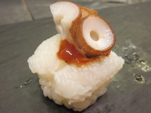 「天然本マグロ」は少し醤油をつけていただきました。ジュワーっと旨みが口中に広がります。「生蛸」は漁場ならではのネタですよね!練り梅の味でいただきます。