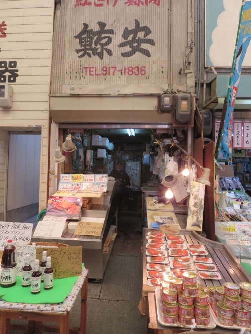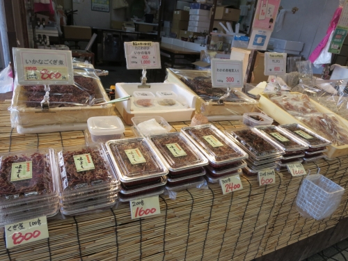 魚の棚商店街に3店舗構える「味よし」ですが、こちらの店舗はうおんたなの一番西側になります。本店とほぼ同じ商品を販売していて、瀬戸内海で春に水揚げされるいかなごのくぎ煮(100g800円)と、わかめ煮(200g600円/400g1,000円)が人気商品。他にも、たこわさびといかの塩辛(100g450円)、干しダコ(1袋600円)などもおすすめ。