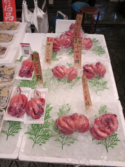 昔ながらのうおんたならしい鮮魚店の一つです。氷の上に鮮魚がズラリと並び、サザエ(1盛りり1,000円)、ヤリイカ(1盛り700円)など、どれもお刺身でいただきたいものばかり!また見るからにプリプリのゆでタコ(700円~)は、大きさを選んで購入できます。まずはそのまま召し上がって、次にお好みでわさび醤油や辛子マヨネーズなどでもどうぞ。歯ごたえ抜群で、旨味が感じられますよ。