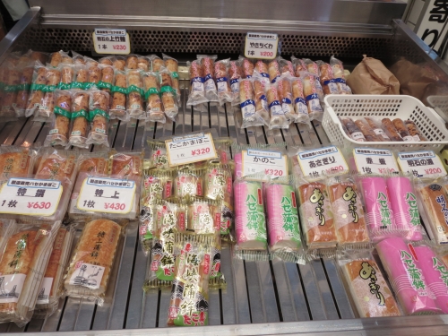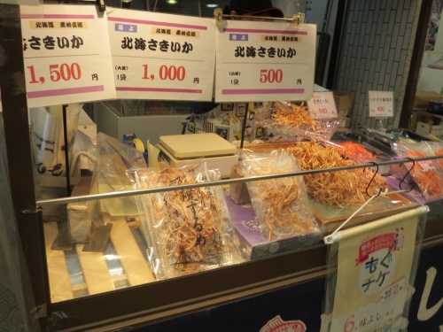 【1】西店と【43】本店で販売されている干物類はありませんが、西店と本店で販売されていない北海さきいか(焼きするめ)が、分量によって500円・1,000円、1,500円で販売されていて大人気!やわらかめでちょうど良い味付けで、一度食べ始めたらやめられない美味しさですよ。干しイカ系が好きな方へのお土産にもオススメ。