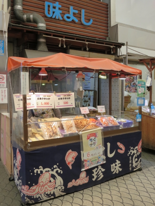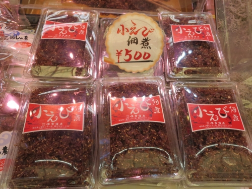 賑やかな看板と沢山の商品につい足を止めてしまいます。こちらでは明石だこのやわらか煮が人気。いかなごのくぎ煮(90g各1,080円)は、生姜味・レモン味・山椒味があります。このほか、炭火焼穴子(大4刺2,400円/6刺3,200円)、小えびの佃煮(1パック500円)なども、お買い物候補に挙がりそう。