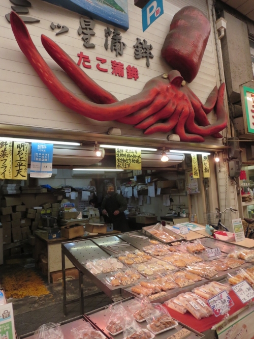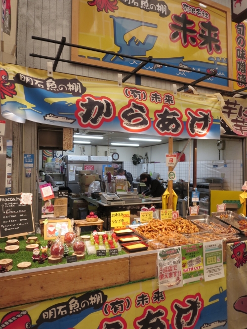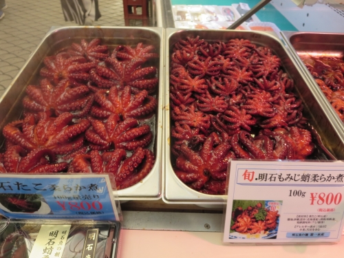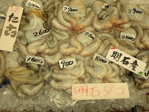 威勢の良い掛け声に、つい足を止めてしまいます。生の明石ダコ(600円~3,000円程度)を取り扱っていますので、ぜひ流れの速い潮流に鍛えられた、太く短い足を観察してみてください。
