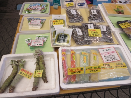 果物・野菜・明石のりなどがズラリ。静岡の本わさび(1,700円)に出会えると購入したくなりますね。梅やもみじ麩(320円)や、手まり麩(5個400円)、えびいもやむかご、ぎんなんなど珍しい商品も販売されています。