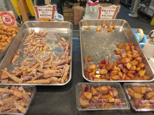 土・日曜日には明石タコや甘えびの唐揚げ(小500円/大1,000円)があったり、さつま芋の美味しい時期には面白いネーミングの芋にぃちゃんや芋ねぇちゃん(1パック600円/セットで1,000円)が販売されています。りんご飴も美味しいのですが、2021年4月現在は新型コロナウイルスでお客さんが減っているため、あまり作っていないようです。こちらも電話予約をオススメします。