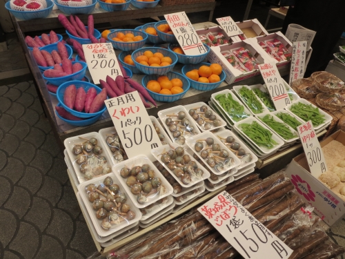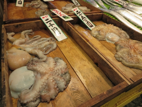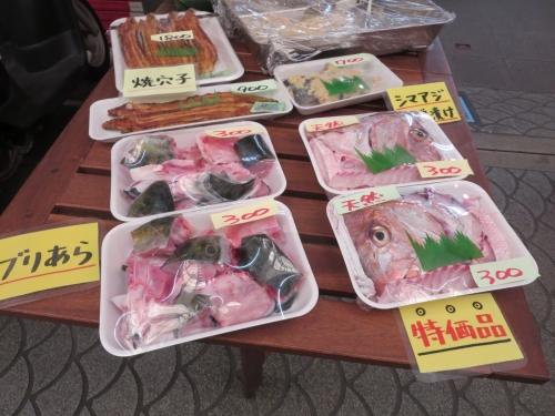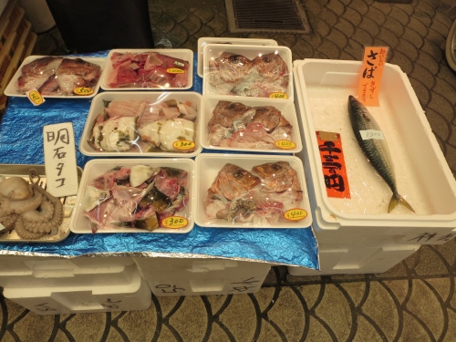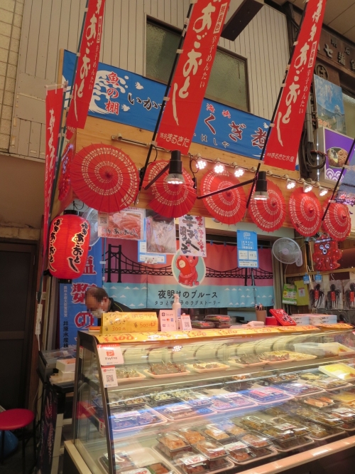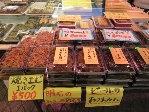明石生たこ(2,200円)、ハリイカ(2杯1,200円)、助子(8腹600円)、切り身やあら、お刺身などが販売されています。特価品に出会えることも。美味しそうな手作りお総菜が並ぶコーナーもありますので、覗いてみてくださいね。