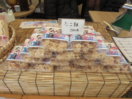 自慢の明石焼きは、生地に利尻昆布をたっぷりと使い、オリーブオイルで焼き上げられています(イートイン、持ち帰りとも15個700円)。明石焼きのほか鯛茶漬(1,350円)も名物で、春や秋の相場が安定している時には天然鯛を使っているそうです。初めは鯛めしとして、次に熱い玄米茶をかけて、最後は薬味も加えていただくのがオススメだそう。