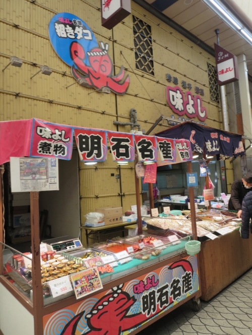昔ながらの木箱に入れて並べられた生たこが見られますので、ぜひ足をとめてご覧になってくださいね。鮮度を保つために、スタッフの方が時折魚に水をかけています。床は濡れているので長靴を履いており、売上金はビヨンと伸びる紐につるされたバケツへ!そんな明石市民にとって懐かしい光景を目にできますよ。