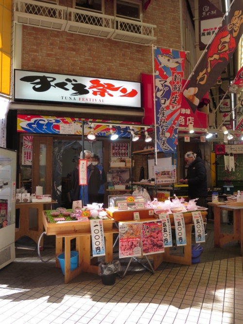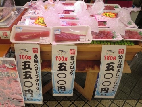 まぐろの柵(100g550円)、ブロック(100g500円)、切り落とし(180g500円)などが並び、店名通りまさにお祭りです(笑)。竜田揚げ(300円)や南蛮漬け(500円)もありますので、味わってみるとまぐろの新しい美味しさが発見できるかも。
