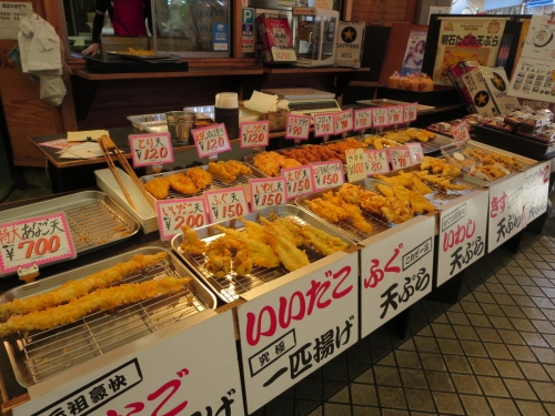 たこせんや珍味、天ぷらなど、色々なジャンルの多くの商品が販売されていて目移りします。ご自宅で明石焼きを作ってみたいな、と思われたら、明石焼きの粉のじん粉(1kg500円)や、明石玉子焼き粉セット(30玉用500円/つけだし付き)、明石玉子焼きミックス粉(100玉用400円)などの商品から一つ選んで購入してみてはいかがでしょうか。このほか、特大穴子1本が丸々揚げられている天ぷら(700円)はインパクトがあり必見ですよ。