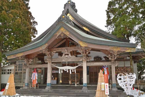 白鳳2年(646)に役小角によって創建されたとされる神社で、太平山を御神体としています。お祀りしている神様は大己貴大神(おおなむちのおおかみ)・少彦名大神(すくなひこなのおおかみ)・三吉霊神(みよしのおおかみ)の三神で、古くより勝利成功・事業繁栄にご利益のある神社として崇拝されてきました。例年、10万人ほどの人が初詣に訪れています。
