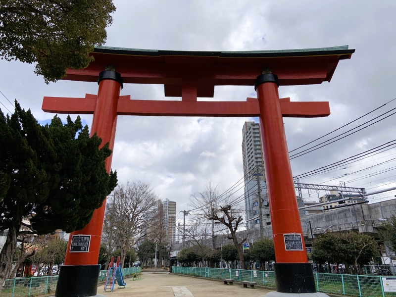 境内には色々な見どころがあります。一番目立っているのが、朱色の大きな鳥居です。こちらは、高さ17メートル、笠木22メートル、柱の直径1.6メートルもある立派なもので、すぐそばを通る阪神電車の車内からも良く見えます。