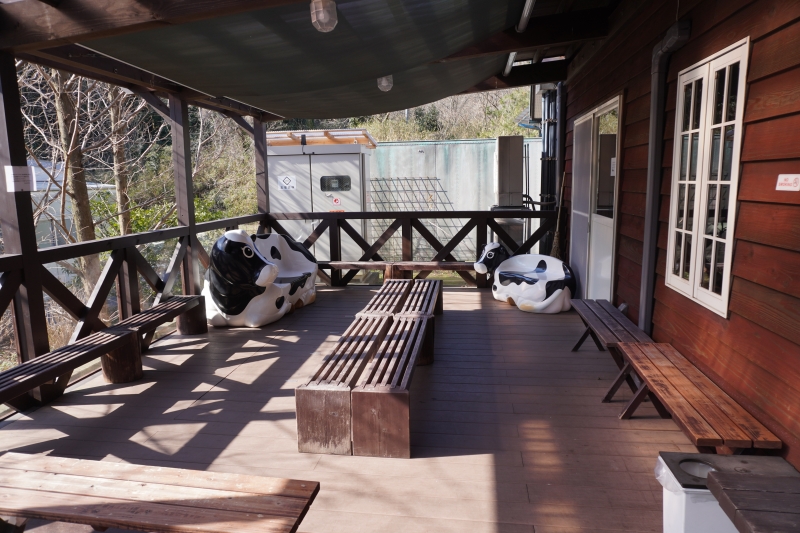店舗の左側にあるウッドテラスでイートインができます。可愛い牛の椅子に座って記念写真するのもいいですね。