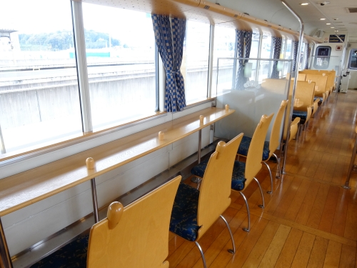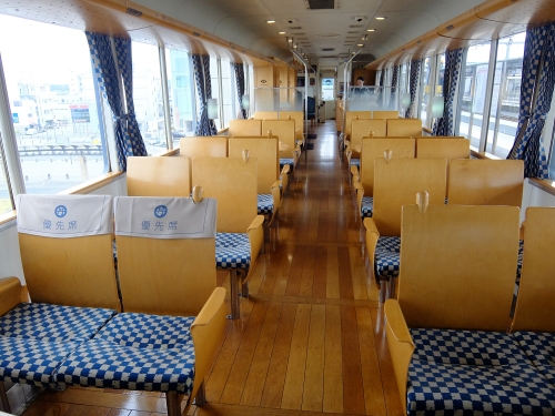 事前予約不要で、普通運賃のみで気軽に乗車できます。車内は車窓を楽しめるカウンター席やくつろげるソファ席、名産品を並べたショーケース、車内販売のサービスなど普通列車と思えない充実ぶりです。