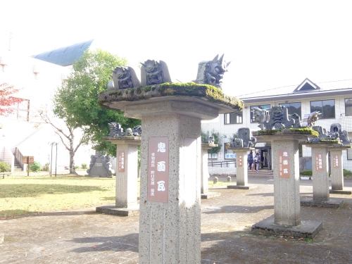途中、大江駅で30分ほど停車し、駅周辺をぶらりと散策。大江山には鬼伝説があり、駅前の大江山鬼瓦公園には沢山の鬼瓦が!またふと足元を見ると、マンホールにも鬼がいたり、街のあらゆるところに鬼が潜んでいるので探してみましょう。