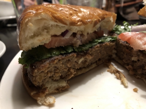 アメリカの定番メニューということでサンドイッチメニューがあるのですが、 やはり欠かせないのがハンバーガー。 しかしこのハンバーガーはビヨンドバーガーといって、植物性食品だけを用いたハンバーガーなのです。近年のアメリカでは「ビヨンドバーガー/beyond burger」という言葉が定着していて、 「ビヨンドバーガー」=植物性食品のハンバーガーということになります。