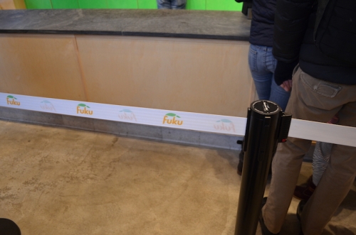 ケンタッキーやマクドナルドと同じように、レジで注文し、商品を受け取るスタイルです。ガードレール格納式ベルトや看板にも「フク」のデザインが施されています。