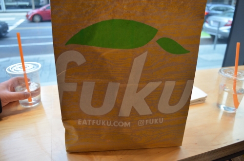 店員は皆「フク」と日本語のロゴがデザインされたユニフォームを着ています。お持ち帰りのバッグにはローマ字で「Fuku」とデザインされています。