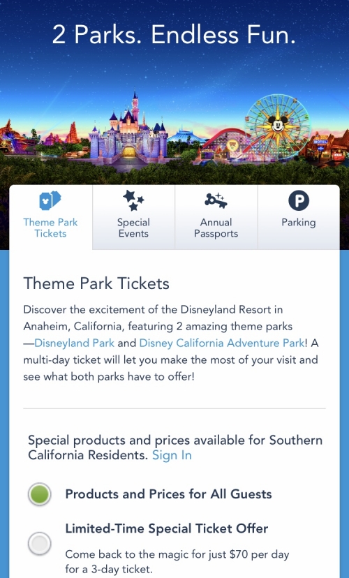 英語のサイトになりますが、オンラインでチケットの購入が可能です。日程、日数、人数などを選んで購入します。1パークのみか、隣接するアドベンチャーパークにも両方いけるチケットにするか選べます。パークは、日本のディズニーランドよりも大きいので1日で両方巡るのは難しいかもしれません。