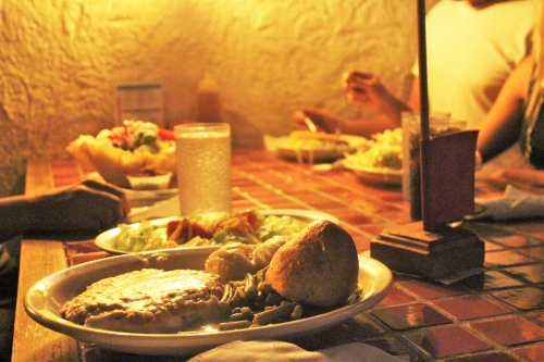 料理を受け取ったら、従業員の指示に従い席に着きます。こちらのお食事は「ファミレスだとこのくらいかな」という感じの味ですが、注文は絶対(完食は迫られません)なので、無料でいただけるのにおいしくてしかも食べ放題のチップス&サルサと、デザートのソパピアに期待しましょう。ソパピアはKFCのビスケットのような味で、ハチミツをかけていただきます。ウエイターを呼びたい場合には、日本のレストランや居酒屋にある呼び出しベルの代わりに卓上の旗を立てましょう。