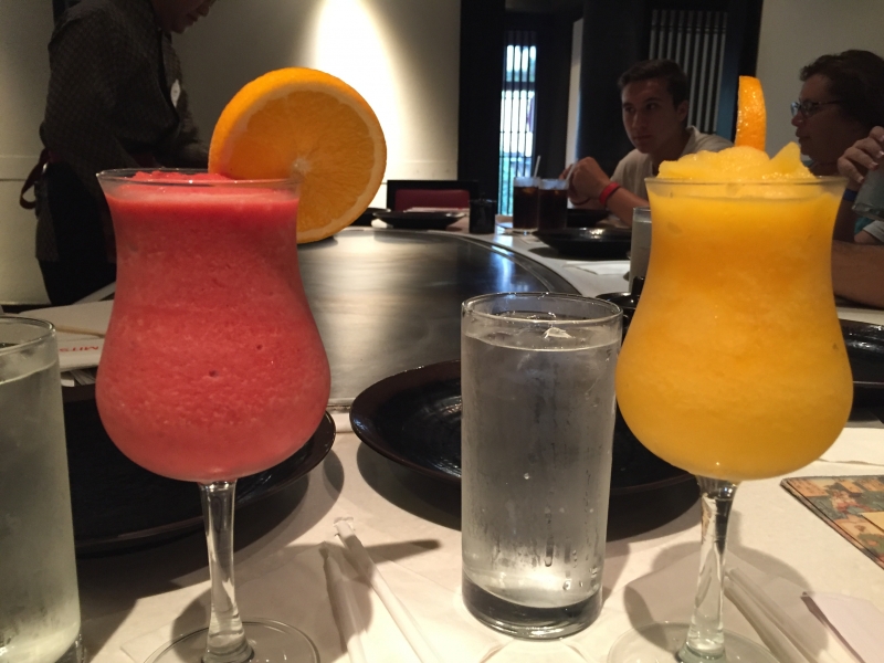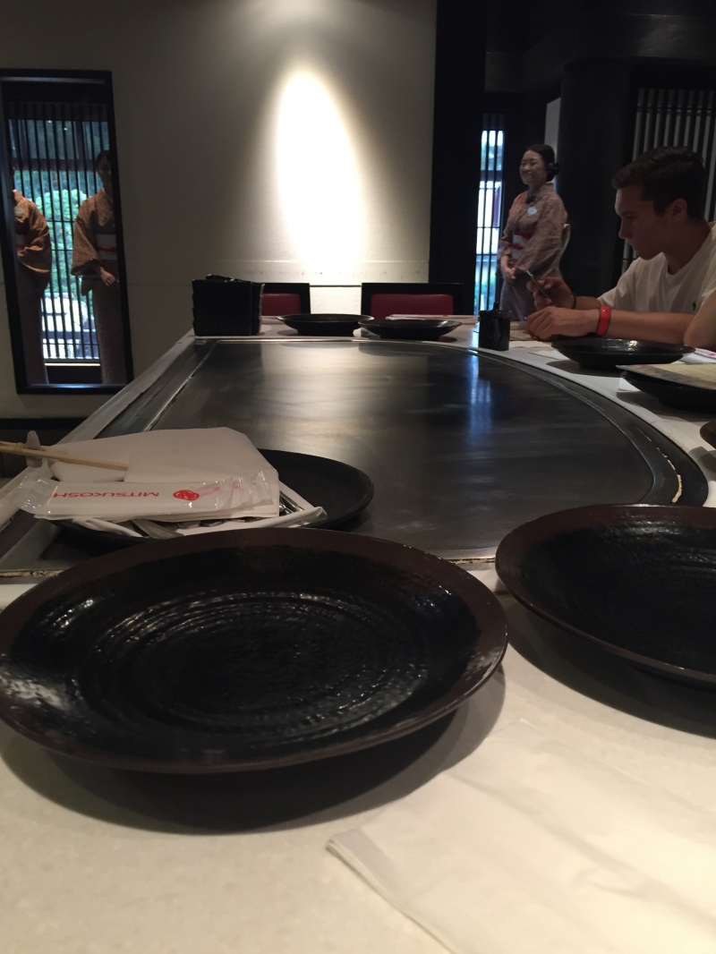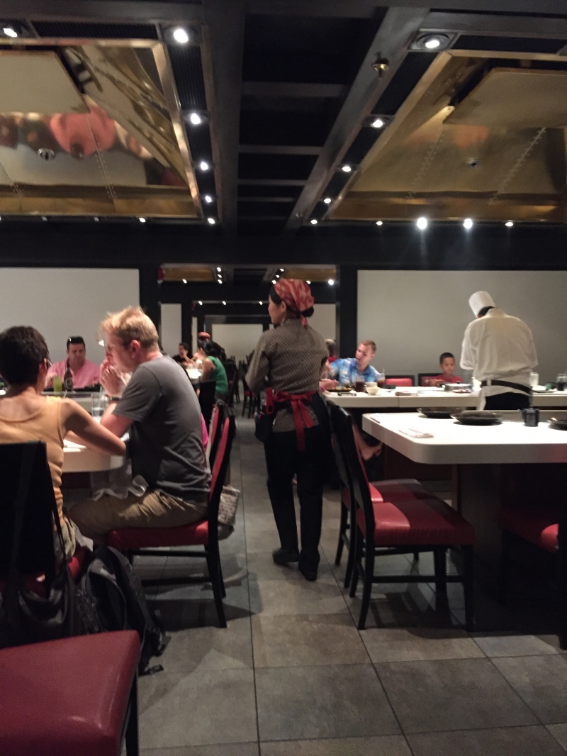 お食事の部屋に通されると、大きな鉄板があるテーブルがあります。こちらのレストランは相席制。他の家族と同じテーブルになることがほとんどです。同じテーブルになったグループには最初に英語であいさつくらいはすると良いでしょう。