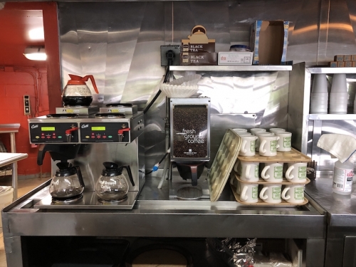 カウンターの目の前には、業務用のコーヒーメーカーが待機しており、コーヒーの匂いが充満しています。