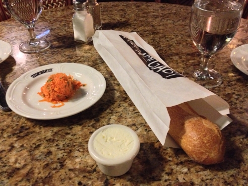 冬場でもパラソルにトーチがついているので暖かく、ゆっくりと食事を楽しめます。袋に入ってサーブされる温かいフランスパンが絶品です。