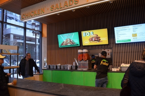 「フク(Fuku)」はアメリカの有名シェフ「デビッド・チャン(David Chang)」がプロデュースするフライドチキンサンドイッチ専門のレストラン。写真のものは「スパイシーフライドチキンサンドイッチ(Spicy Fried Chicken Sandwich)」。8ドル/880円。単純に言えば「韓国風味のケンタッキー」という感じで、辛いジャンクフードが好きな人には強くおすすめします。