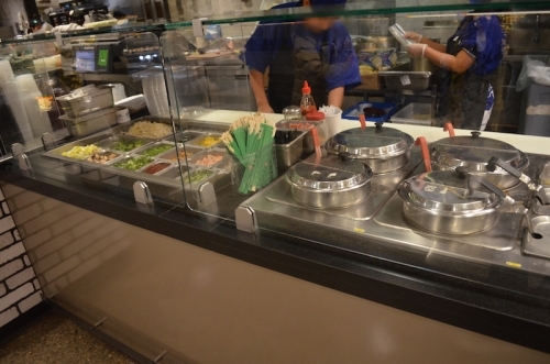 「ヌードルハウス/NOODLE HOUSE」は、アメリカの大手スーパー「ホールフーズ/Whole Foods Market」の中に併設されているラーメン屋です。メニューは大きく分けて「ライスヌードル」「ラーメン」「混ぜ麺」の3種類。ベジタリアンメニューもあるなど、アメリカらしいです。写真のものはスパイシー豚骨チャーシュー。11.90ドル/1,309円。テイクアウトもできます。