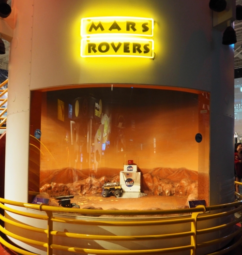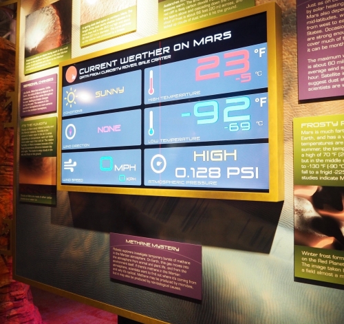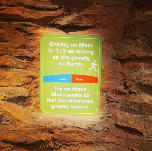 火星にフォーカスしたのが、この「Mission Mars」コーナー。火星と地球の環境の違いがポップなビジュアルでわかりやすく展示されています。人類が次に住める惑星として有力らしい火星は、重力は地球の3分の1、最低気温はマイナス70℃。天気や風速など地球と同じように気候が表示されていて、何だかとても身近に感じます。