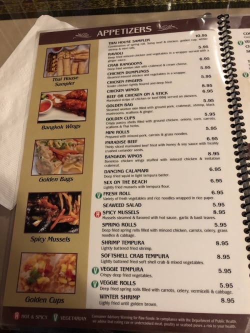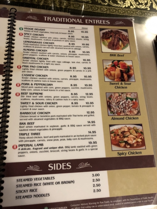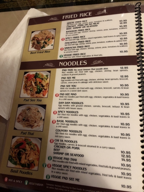 その名の通り、タイ料理が中心のレストランですが、ほかの地域のアジア料理も扱っています。いわゆる、アメリカによくある「パンアジア料理/Pan Asian」もしくは「アジア系アメリカ料理/Asian American」といった内容です。